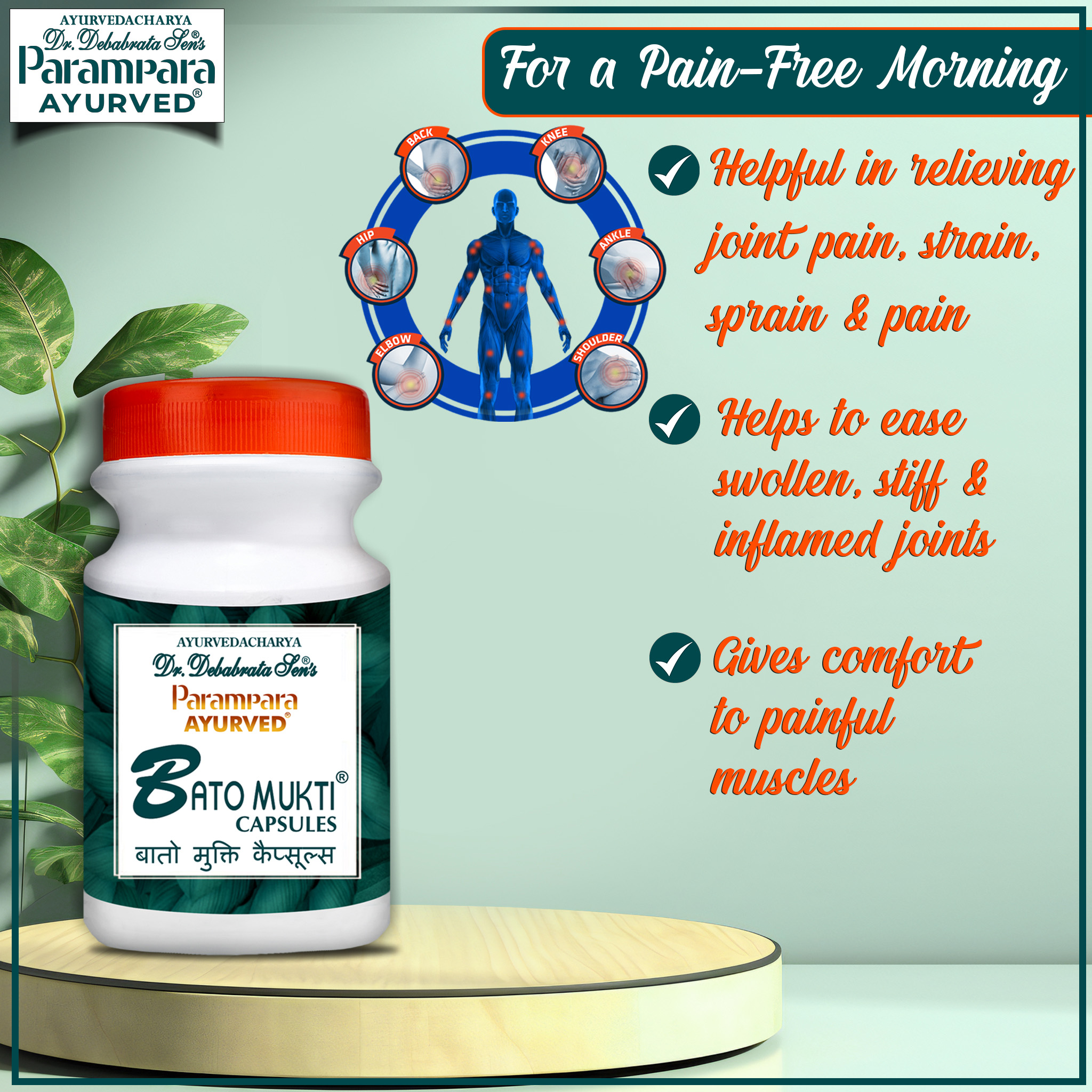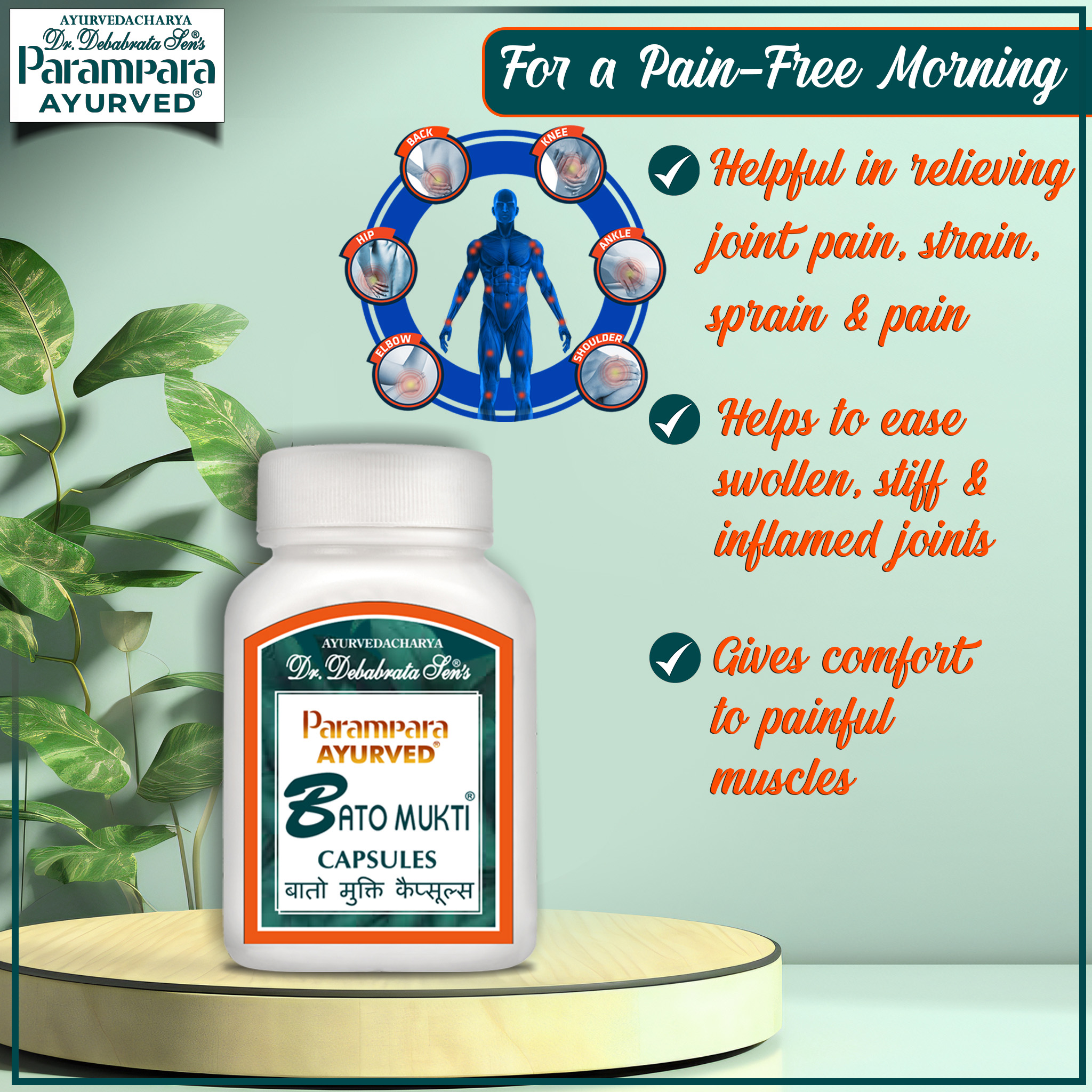 Parampara Ayurved's Bato Mukti capsules harness the healing properties of Nishinda (Neem), Rasna, Ashwagandha, Nageswar (Jatamansi), Mutha (Licorice), and Eranda (Castor oil). This blend is likely formulated to alleviate joint pain and inflammation. Neem and Rasna offer anti-inflammatory benefits, while Ashwagandha supports overall joint health. Nageswar and Mutha contribute to overall pain relief and inflammation reduction. Eranda's anti-inflammatory effects may further aid in joint discomfort alleviation. Together, these herbs create a comprehensive solution for joint health, targeting inflammation and pain.