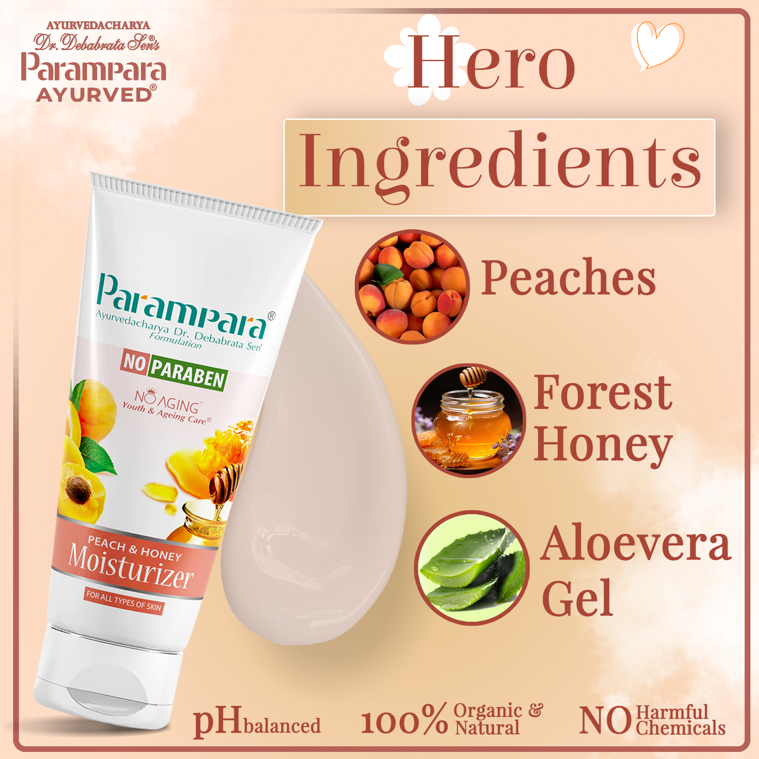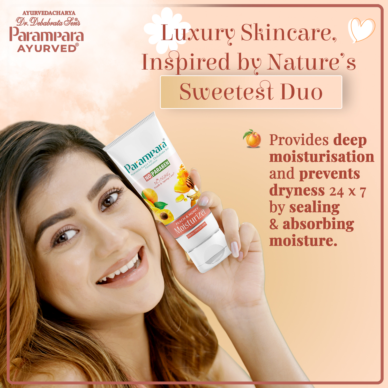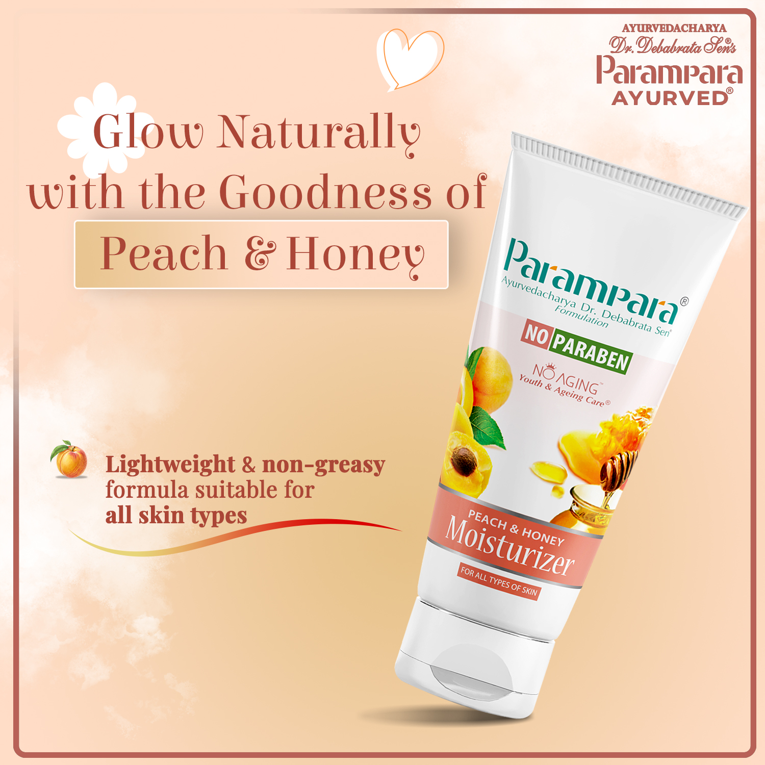 Unlock Soft, Glowing Skin with Parampara Ayurved Peach & Honey Face Moisturizer Cream. Experience the power of nature with our Peach & Honey Face Moisturizer Cream, designed to deliver intense hydration, repair dry skin, and restore your skin's natural glow. Enriched with real peach extracts and pure honey, this Ayurvedic cream is your perfect companion for healthy, radiant skin. Deep Hydration for Dry Skin Say goodbye to dryness and rough patches! The nourishing formula penetrates deep into the skin to replenish moisture, leaving your skin soft, supple, and hydrated all day long. Non-Sticky, Lightweight Formula. Our moisturizer absorbs quickly without feeling greasy, making it perfect for everyday use on all skin types, including sensitive skin. It ensures a smooth and non-sticky finish for maximum comfort. Natural Radiance Booster. Infused with the vitamins and nutrients of peach extracts, this cream works to promote a plump, youthful complexion. It’s the ideal base for makeup or a standalone solution for glowing, healthy skin. Gentle & Ayurvedic Skincare Crafted with a thoughtful, Ayurvedic formula, our moisturizer is suitable for men and women. The combination of peach and honey soothes, nourishes, and protects your skin, enhancing its natural barrier. Luxurious Peach Fragrance. Delight your senses with the delicate aroma of fresh peaches. This moisturizer adds a luxurious touch to your skincare routine while refreshing and rejuvenating your skin. Achieve radiant, hydrated skin with the Parampara Ayurved Peach & Honey Face Moisturizer Cream—your ultimate solution for dry skin care and a natural glow! Perfect for daily use, morning and night.
