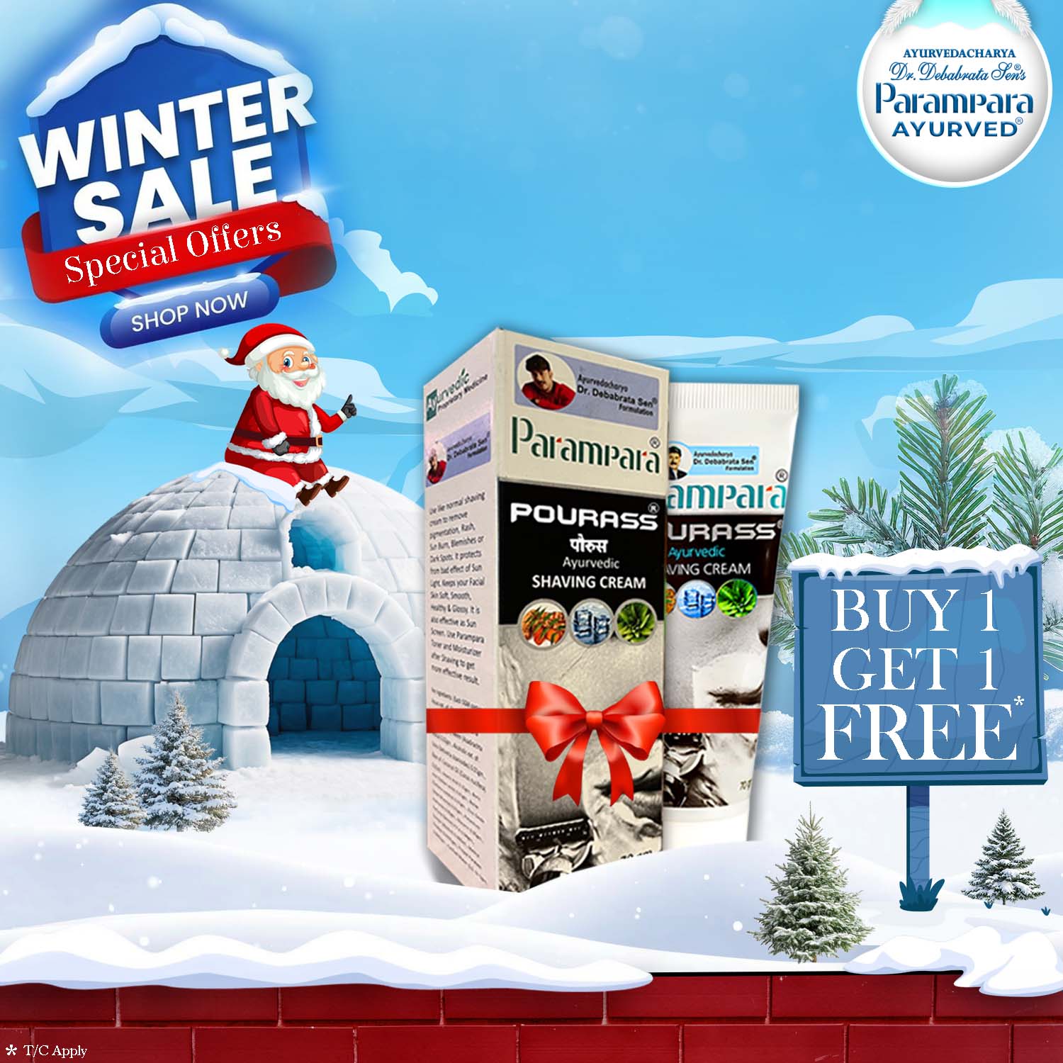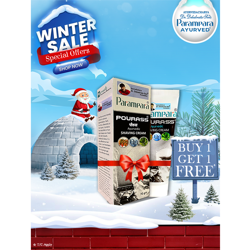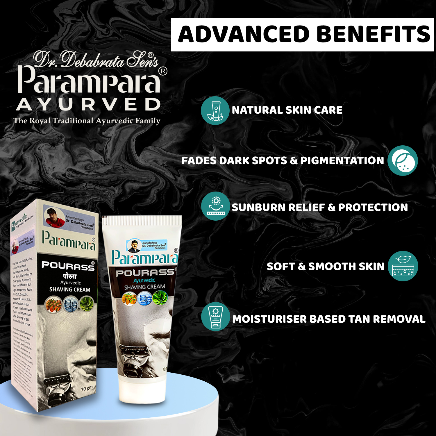 Parampara Ayurvedic Pourass Shaving Cream is a unique blend of natural ingredients designed to provide a smooth, soothing, and rejuvenating shaving experience. This Ayurvedic formula is enriched with Aloe Vera, Neem, Coconut Oil, and other powerful herbs to protect your skin from the harmful effects of shaving while addressing common skin concerns such as pigmentation, dark spots, blemishes, and sunburn.