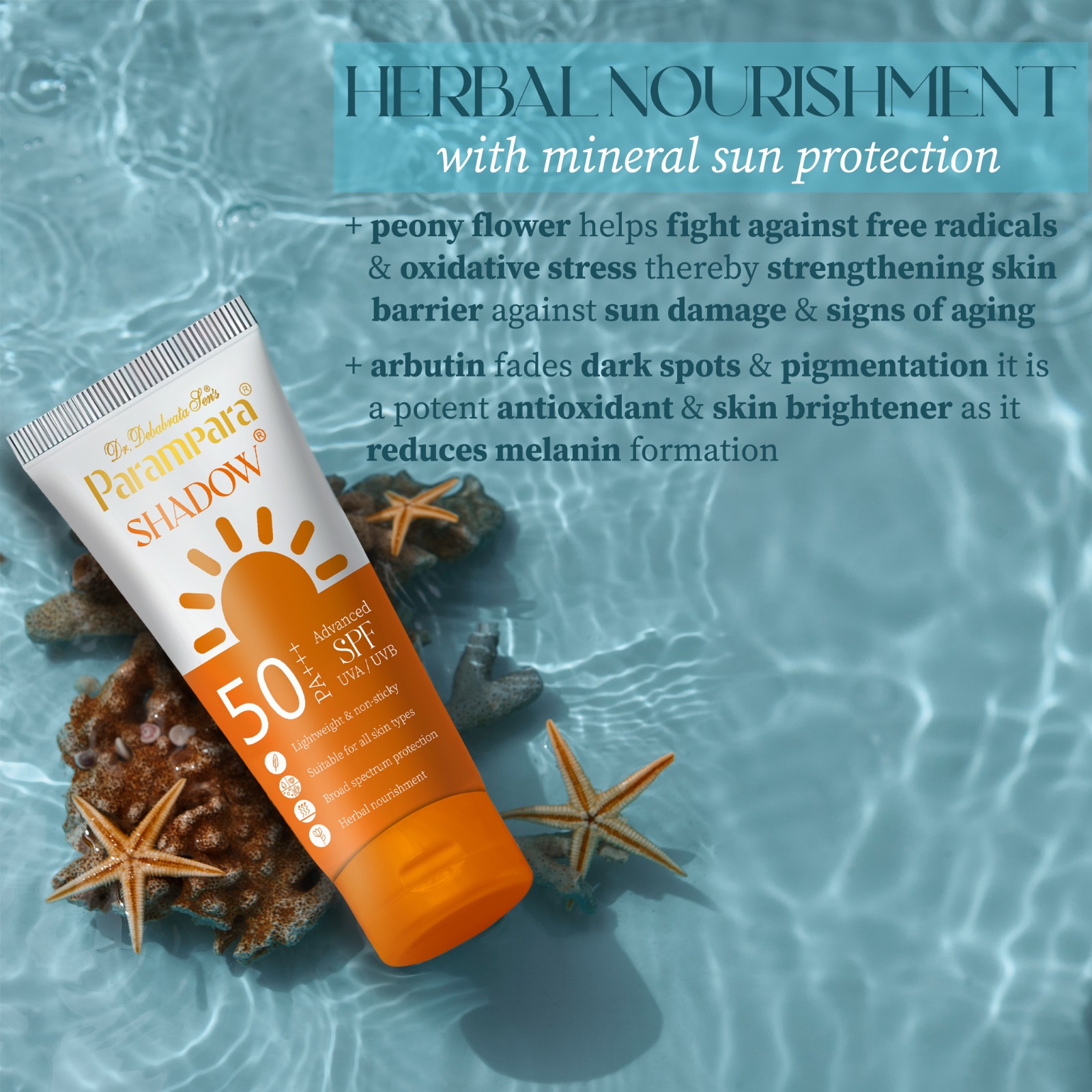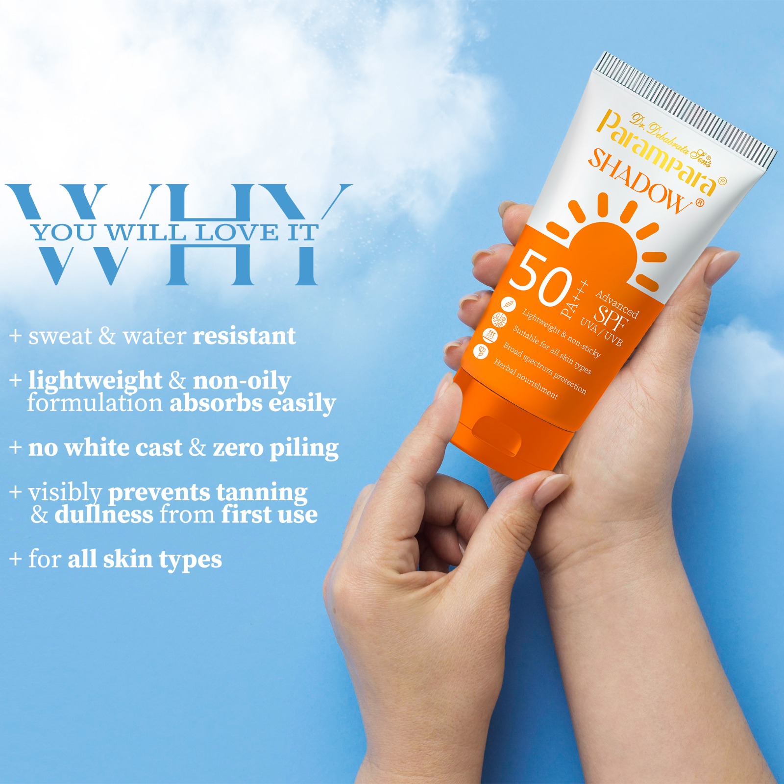 Ensure your skin stays protected and nourished with Parampara Shadow Advanced Sunscreen SPF 50 PA+++. This high-performance sunscreen provides broad-spectrum protection against harmful UVA and UVB rays, helping to prevent sunburn, skin damage, and premature aging. With its lightweight, non-greasy formula, it absorbs quickly into the skin, leaving no sticky residue, making it perfect for all skin types, including sensitive skin.