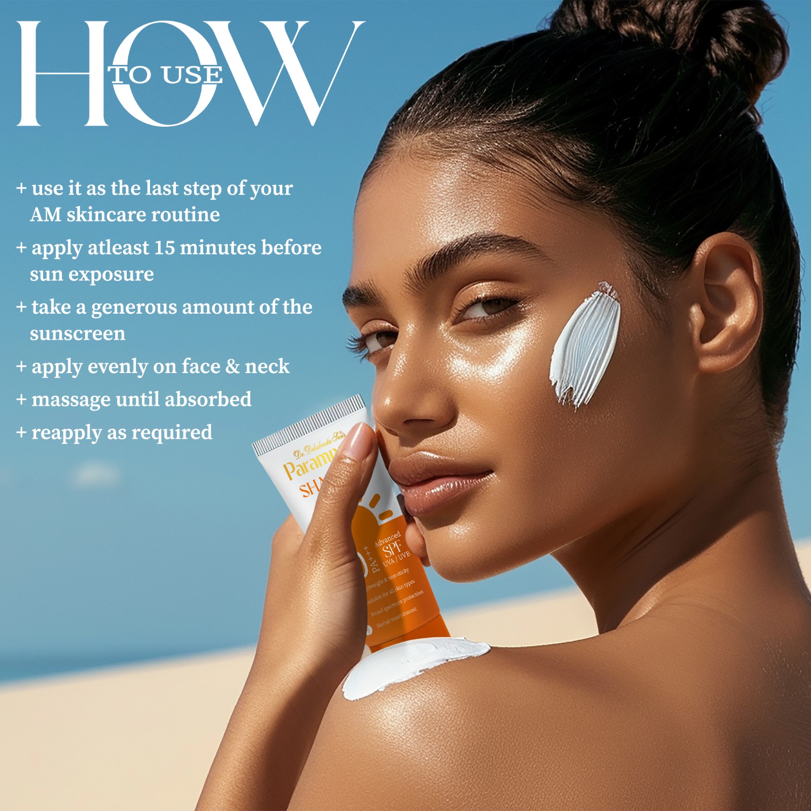 Perfect as a daily skincare essential, Parampara Shadow Advanced Sunscreen SPF 50 PA+++ can be used as a smooth base under makeup, providing a flawless, radiant look while offering all-day sun protection. With regular use, it helps protect against fine lines, pigmentation, and sunspots, keeping your skin youthful, healthy, and glowing.