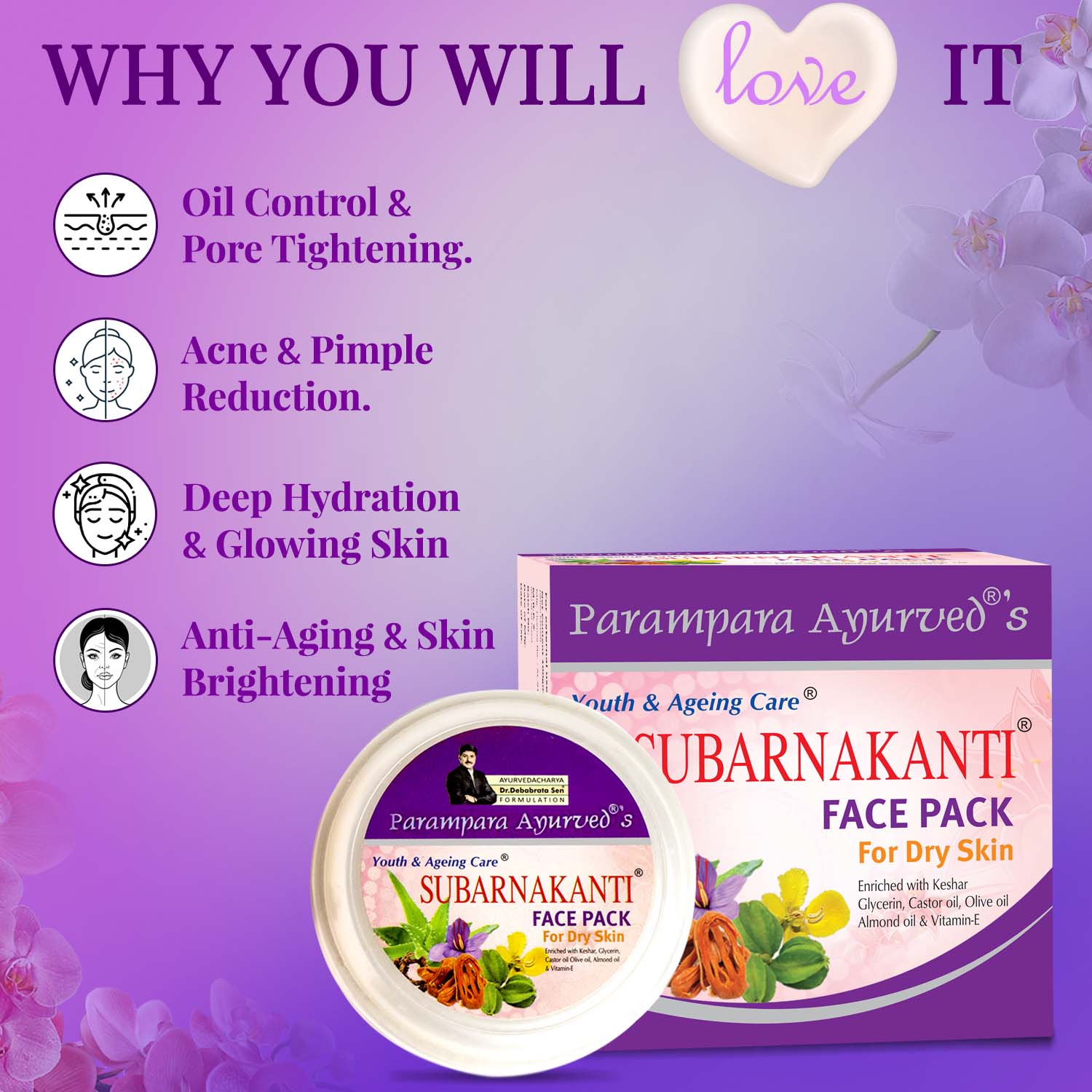 Give your skin the ultimate Ayurvedic care with Parampara Ayurved Subarnakanti Face Pack, a luxurious blend of Saffron (Kesar), Vitamin E, Aloe Vera, and Sandalwood designed to deeply nourish, hydrate, and brighten your complexion. This natural and clay-infused formula helps tighten pores, reduce acne, and improve skin tone, making your skin feel soft, smooth, and radiant.