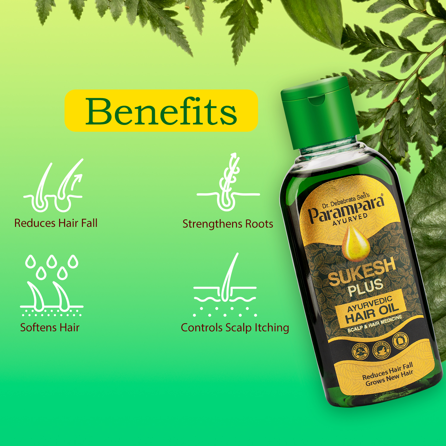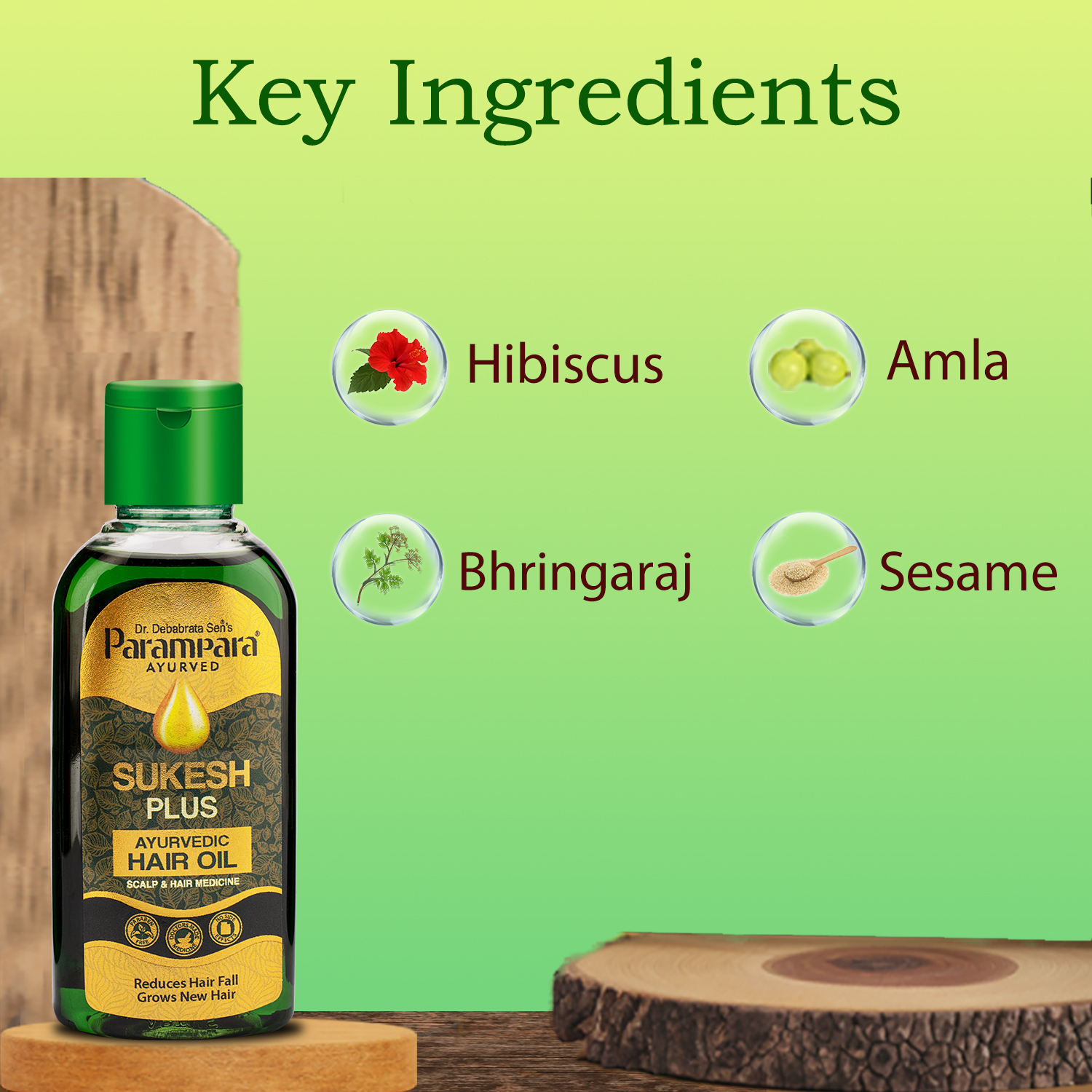 Parampara Ayurved Sukesh Plus Hair Oil is a potent and natural blend of Hibiscus, Amla, Bhringaraj, and Sesame, carefully formulated to promote healthy hair growth, reduce hair fall, and enhance overall hair health. This herbal hair oil is enriched with powerful ingredients like Kakananti, Kanaka, Nirgundi, Tila, Dhatri, Jaba Phool, and Sandal, which work together to nourish the scalp, improve blood circulation, and combat common hair problems such as dandruff, itching, and dryness.
