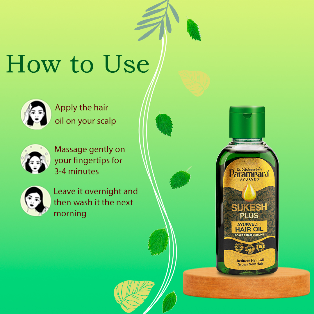 The unique properties of Sukesh Plus Hair Oil provide deep conditioning, strengthen hair follicles, and restore shine and luster. It also protects the hair and scalp from UV rays, pollution, and environmental stressors, preventing further damage. Regular use of this hair oil helps to balance the scalp's natural oils, promoting thicker, healthier, and more vibrant hair. Apply as a daily hair oil treatment to effectively control excessive hair fall, prevent premature graying, and stimulate new hair growth for fuller, thicker hair.