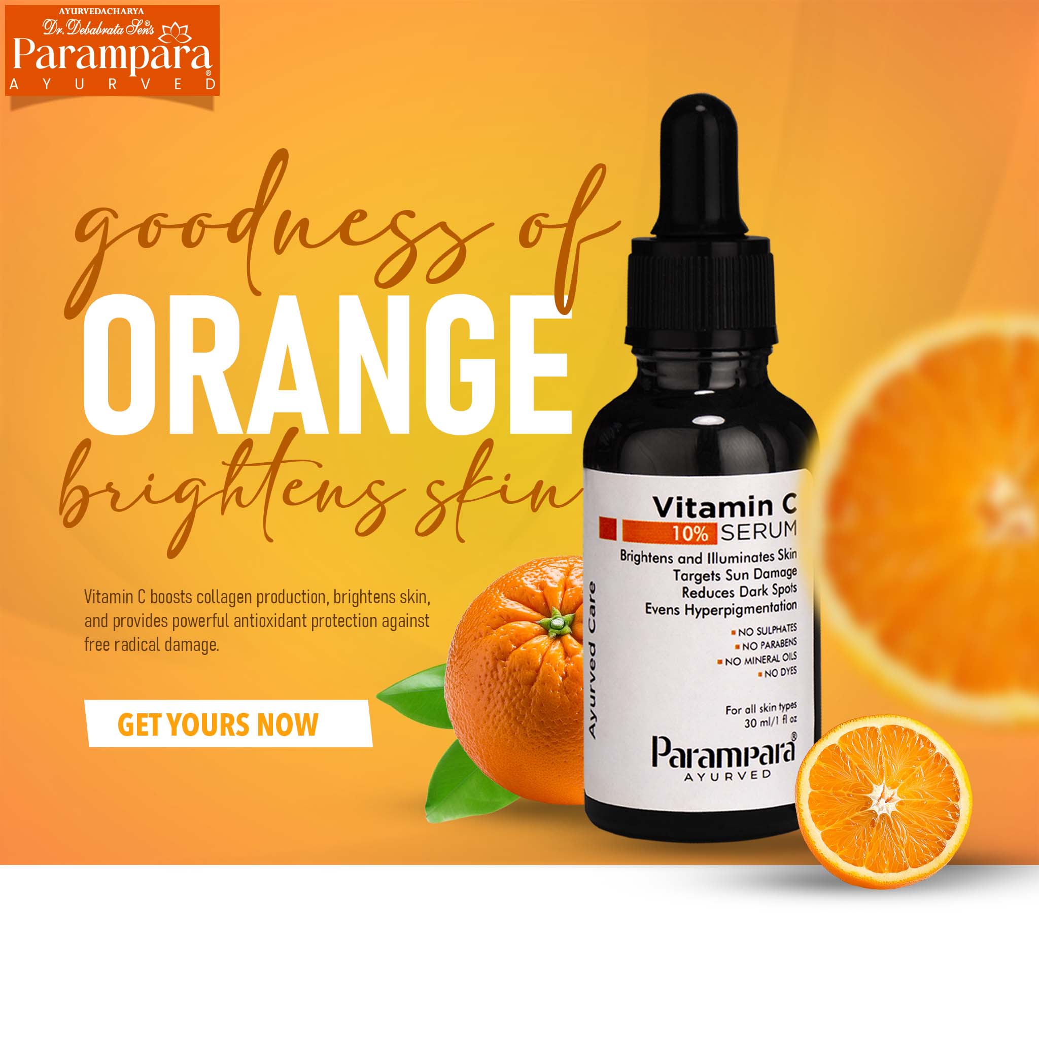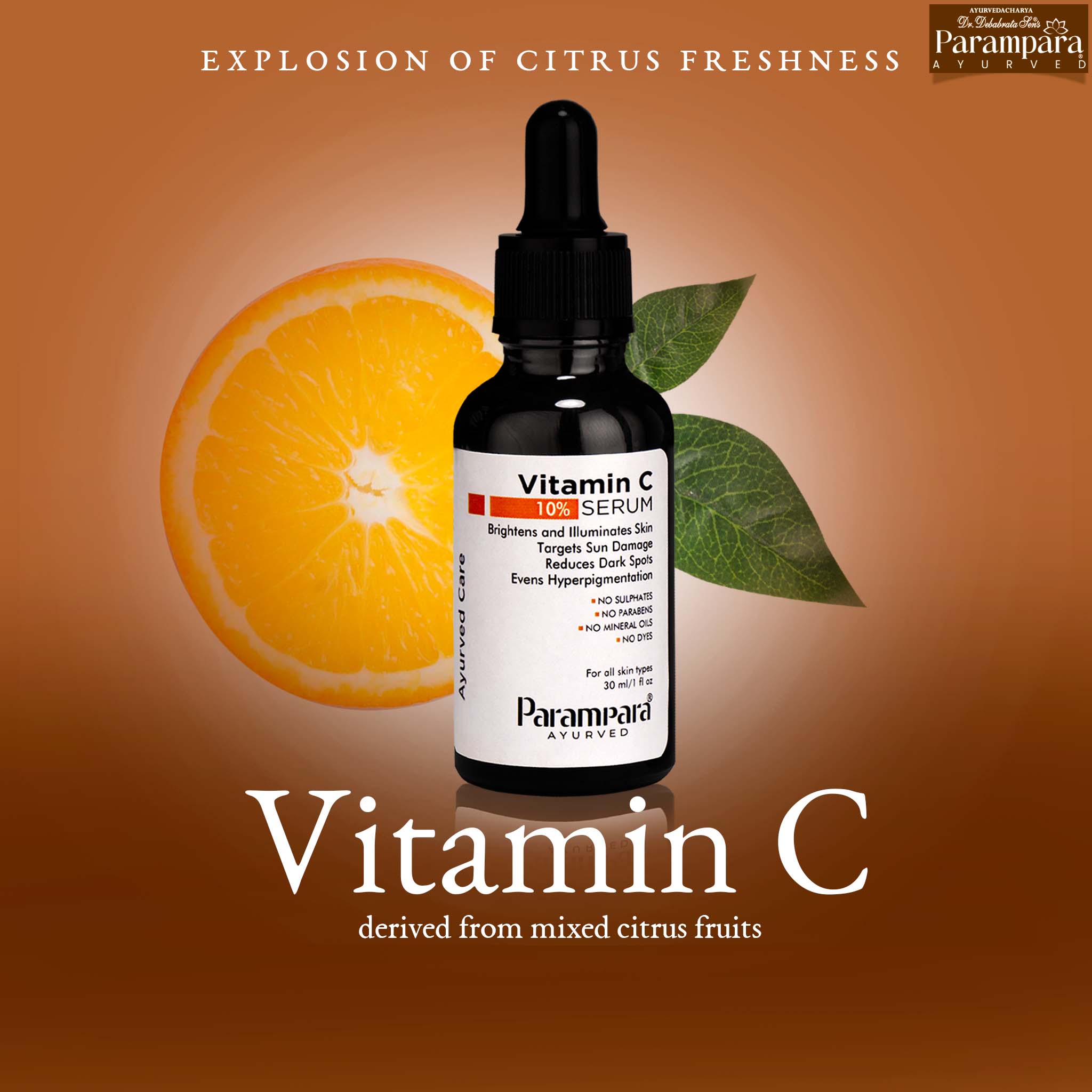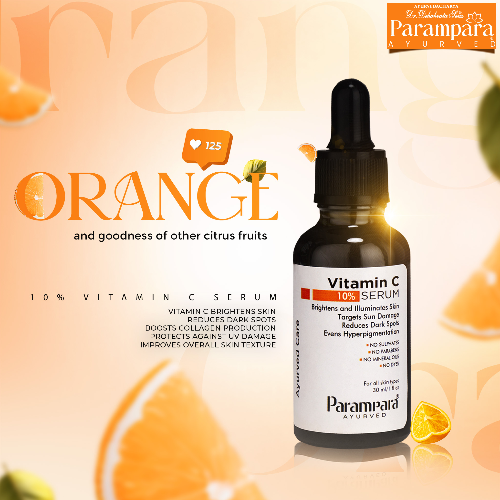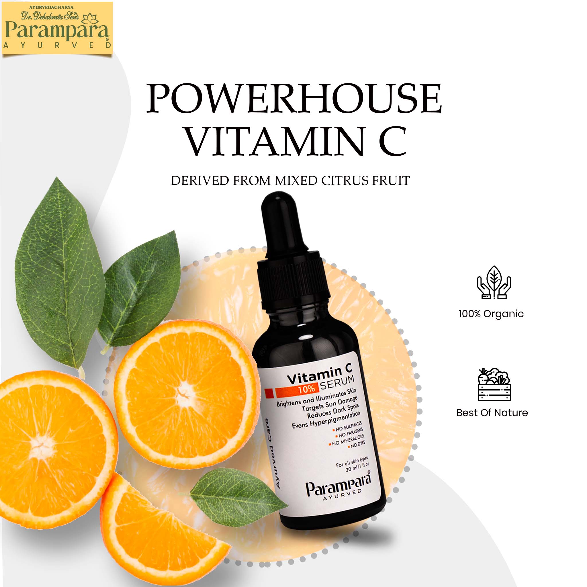 Parampara Ayurved Vitamin C Face Serum – Radiance & Protection for Healthy, Glowing Skin. Transform your skincare routine with Parampara Ayurved Vitamin C Face Serum, a powerful blend enriched with 10% Vitamin C derived from mixed citrus fruits. This serum is expertly formulated to brighten your complexion, reduce dark spots, and promote an even skin tone. Its potent antioxidant properties shield your skin from environmental damage caused by sun exposure and pollution, helping prevent premature aging. Infused with Vitamin C, this serum boosts collagen production, improving skin elasticity and reducing fine lines and wrinkles for a youthful, firm appearance. Its lightweight, non-greasy formula absorbs quickly, delivering intense hydration and leaving your skin feeling soft, smooth, and refreshed without clogging pores. Crafted with natural, plant-based ingredients, the serum is free from harmful parabens, sulfates, mineral oils, and dyes, making it safe and gentle for all skin types, including sensitive skin. Designed for both men and women, it is vegan-friendly and ideal for daily use. Elevate your skincare game with Parampara Ayurved Vitamin C Face Serum – your go-to solution for brighter, healthier, and younger-looking skin.